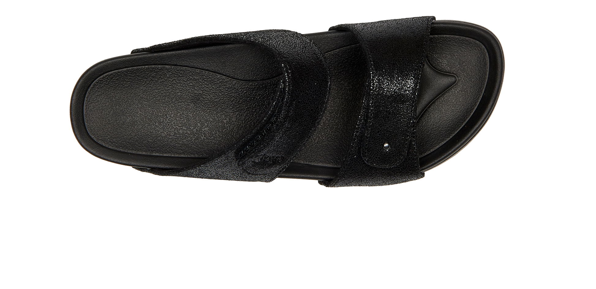 Slippers in sparkling split leather and soft textile lining. Adjustable velcro straps will help to have an optimal fitting. This technology has a soft footbed and a wide soft sole, which provides stability and cushioning. Suitable for people with a sensitive back and with feet and joints exposed to daily stress.